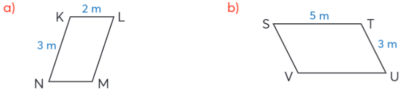 Nêu các cặp cạnh đối diện song song và bằng nhau của mỗi hình bình hành dưới đây. Nêu số đo các cạnh của hình bình hành.
