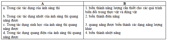 + Trong các tác dụng của ánh sáng thì quang năng được biến thành các dạng năng lượng khác