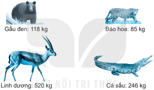 Tên các con vật thứ tự cân nặng từ lớn đến bé là: Linh dương, cá sấu, gấu đen, báo hoa.