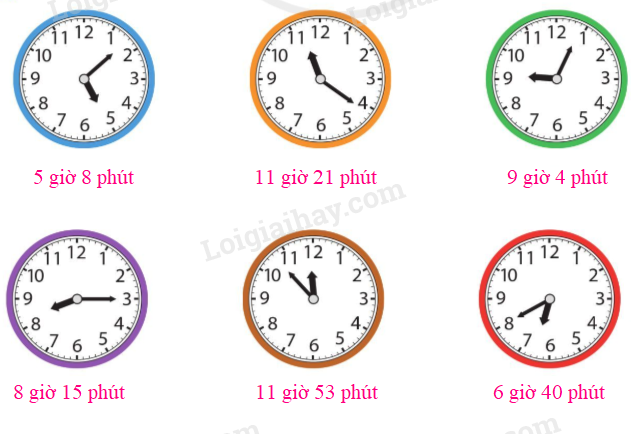Xác định vị trí của kim giờ và kim phút trên mỗi đồng hồ rồi đọc giờ thích hợp.
