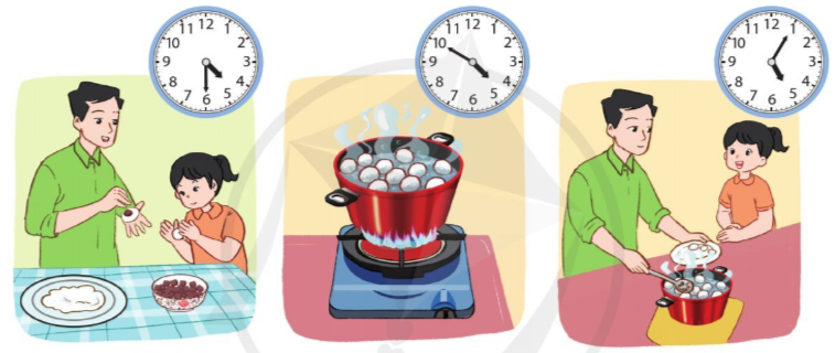 b) Hai bố con bắt đầu làm bánh lúc 4 giờ 30 phút và làm xong bánh lúc 5 giờ 5 phút. Vậy hai bố con đã làm bánh trong thời gian 35 phút.