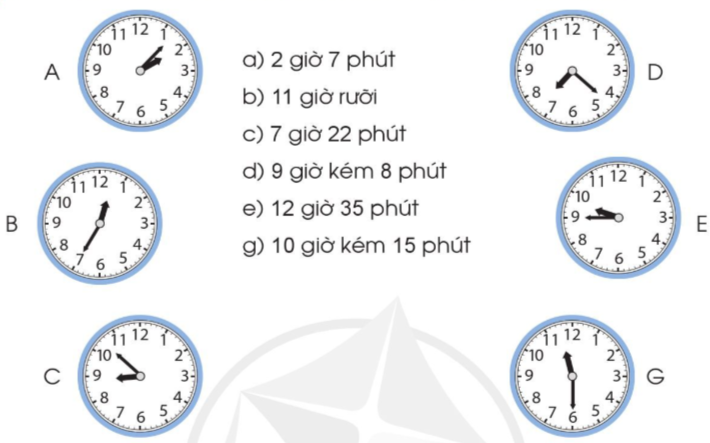 Xác định vị trí của kim giờ và kim phút trên mỗi đồng hồ rồi đọc giờ thích hợp.