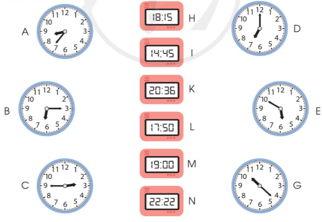 Xem đồng hồ rồi nối với đồng hồ điện tử chỉ cùng giờ vào buổi chiều hoặc buổi tối.