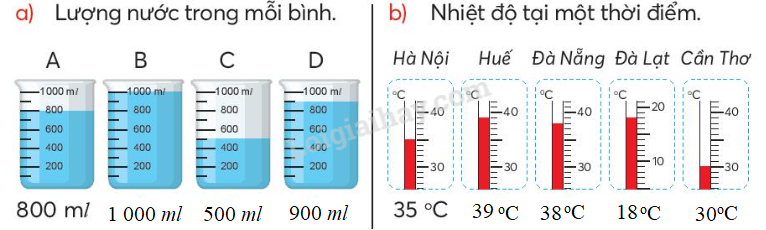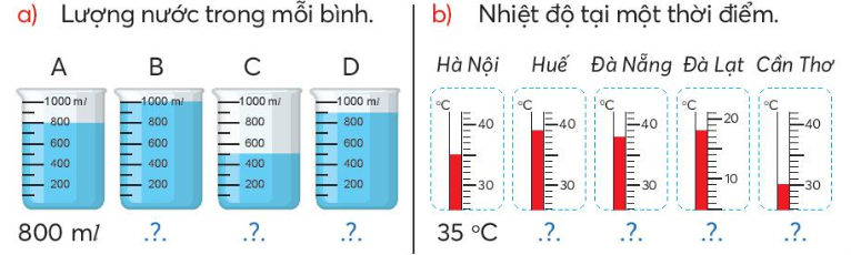 Quan sát mức nước và mức thủy ngân trong mỗi hình rồi điền số thích hợp vào chỗ chấm.