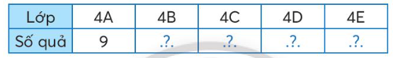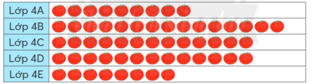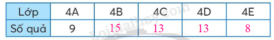 d) Sắp xếp tên các lớp theo thứ tự số lượng quả từ ít đến nhiều là: 4E; 4A ; 4C; 4D ; 4B