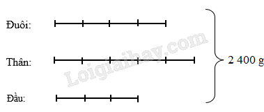 Một con cá nặng 2 kg 400 g gồm đầu, thân và đuôi. Cả thân và đuôi nặng gấp 3 lần đầu cá. Thân cá nặng bằng $\frac{5}{3}$ đầu cá. Tính khối lượng thân cá.