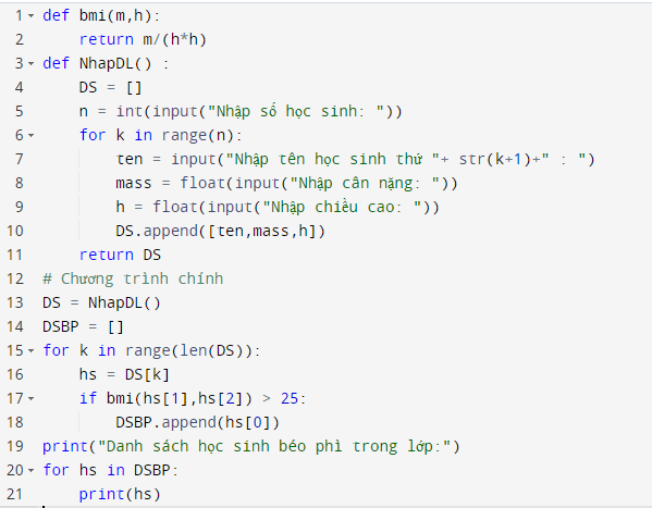 Chương trình sau sẽ yêu cầu nhập một danh sách học sinh trong lớp cùng với cân nặng, chiều cao, sau đó tự động tính chỉ số BMI và in ra danh sách các bạn béo phì. Quan sát chương trình và đưa thêm các lệnh in giá trị trung gian để kiểm soát lỗi chương trình.