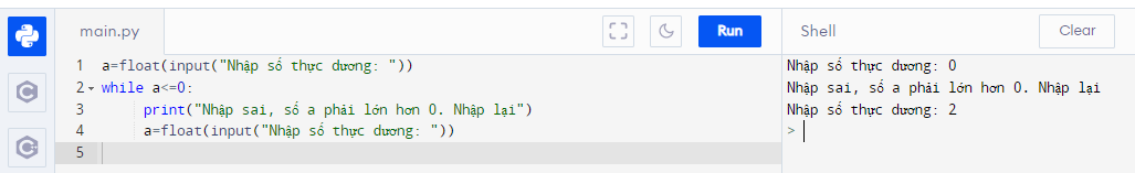 Viết chương trình yêu cầu nhập số thực dương a. Chương trình cần kiểm tra dữ liệu nhập như sau: Nếu số đã nhập nhỏ hơn hoặc bằng 0 thì thông báo: “Nhập sai, số a phải lớn hơn 0. Nhập lại”. Chương trình chỉ dừng sau khi người dùng nhập đúng.