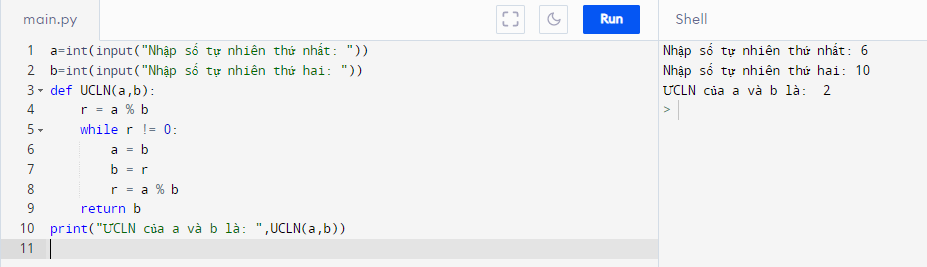 print(“ƯCLN của a và b là: “,UCLN(a,b))