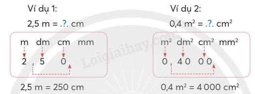 Ví dụ 2: vì 1 m2 = 10 000 cm2 nên 0,4 m2 = 4 000 cm2.