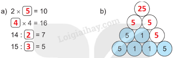 b) Ta nhận thấy quy luật: Tích hai số cạnh nhau bằng số ở giữa và thuộc hàng trên. Từ đó điền được các số còn thiếu.