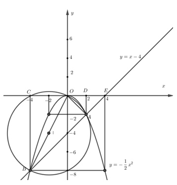 Vẽ đồ thị của các hàm số \(y =  – \dfrac{1}{2}{x^2}\)  và \(y = x – 4\)  trên cùng một mặt phẳng tọa độ. Gọi A và B là các giao điểm của đồ thị hai hàm số trên. Tính bán kính của đường tròn ngoại tiếp tam giác OAB, với O là gốc tọa độ (đơn vị đo trên các tọa độ là centimet).
