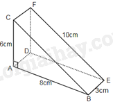 Tính thể tích khối gỗ hình lăng trụ đứng ABC.DEF có các kích thước như hình vẽ bên.