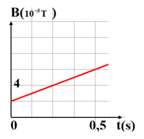\(e =  – \dfrac{{\Delta \phi }}{{\Delta t}} =  – \dfrac{{N({B_2} – {B_1})S\cos 0}}{{{t_2} – {t_1}}} =  – \dfrac{{10.({{6.10}^{ – 3}} – {{2.10}^{ – 3}}){{.25.10}^{ – 4}}}}{{0,5}} = {2.10^{ – 4}}V\)