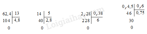 Đặt tính rồi tính. 62,4 : 13 14 : 5 2,28 : 0,38 0,45 : 0,6 Tìm x. Biết 36l dầu cân nặng 27kg. Một can chứa dầu cân nặng 10,5kg. Hỏi trong can đó chứa bao nhiêu lít dầu, biết rằng can rỗng cân nặng 1,5kg?