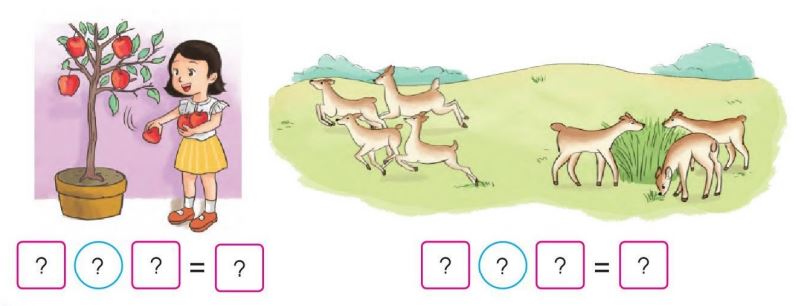 Quan sát tranh, điền số hoặc điền dấu thích hợp vào ô trống.