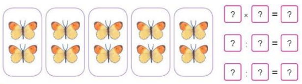 Đếm số con bướm trong mỗi khung và số khung như thế. Sau đó viết phép nhân và phép chia thích hợp vào ô trống.
