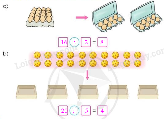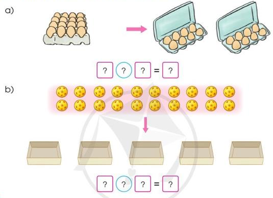 Đếm số quả trứng trên khay và số chiếc hộp đựng trứng, từ đó viết phép chia tương ứng.