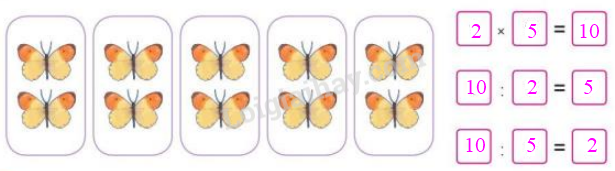 Đếm số con bướm trong mỗi khung và số khung như thế. Sau đó viết phép nhân và phép chia thích hợp vào ô trống.