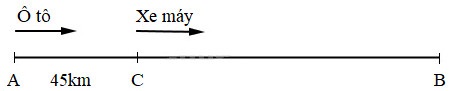 Một xe máy đi từ C đến B với vận tốc 36 km/giờ. Cùng lúc đó một ô tô đi từ A cách C 45km đuổi theo xe máy với vận tốc 51 km/giờ (xem hình vẽ). Tính thời gian đi để ô tô đuổi kịp xe máy.