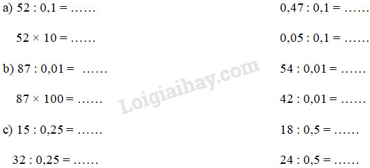 – Muốn chia một số tự nhiên cho 0,1; 0,01; 0,001; … ta chỉ việc thêm vào bên phải số đó một, hai, ba, … chữ số 0.