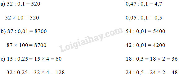 – Muốn chia một số tự nhiên cho 0,1; 0,01; 0,001; … ta chỉ việc thêm vào bên phải số đó một, hai, ba, … chữ số 0.