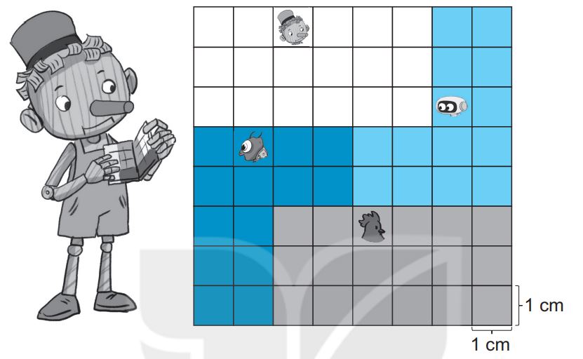 Dế mèn : ….. cm2, rô-bốt: ….. cm2, gà: ….. cm2, Bu-ra-ti-nô: ….. cm2.