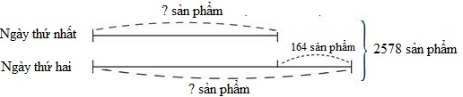 Một tổ sản xuất làm trong hai ngày được \(2578\) sản phẩm, ngày thứ hai sản xuất được nhiều hơn ngày thứ nhất \(164\) sản phẩm.