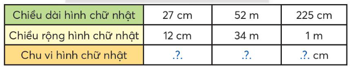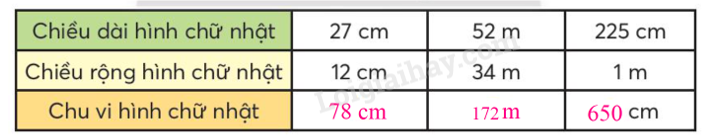 – Chu vi hình chữ nhật có chiều dài 27 cm và chiều rộng 12 cm là (27 + 12) x 2 = 78 (cm)