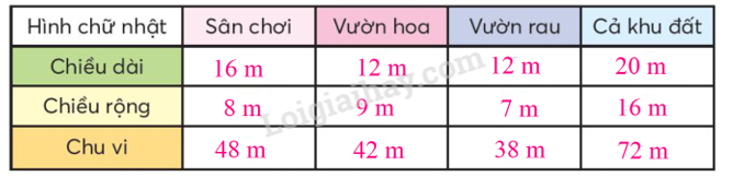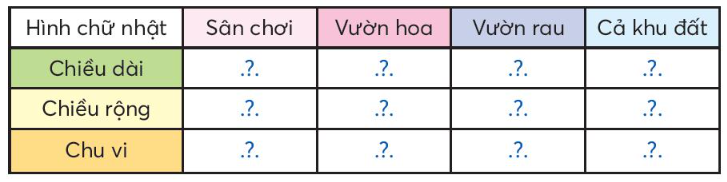 – Quan sát tranh rồi viết số đo chiều dài, chiều rộng của sân chơi, vườn hoa, vườn rau, cả khu đất vào ô trống.