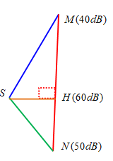 \(\left\{ \begin{array}{l}\underbrace {{L_H} – {L_M}}_{20(dB)} = 20\log \dfrac{{SM}}{{SH}} \to SM = 10SH\\\underbrace {{L_H} – {L_N}}_{10(dB)} = 20\log \dfrac{{SN}}{{SH}} \to SN = \sqrt {10} SH\end{array} \right. \to MH + HN = \underbrace {\sqrt {S{M^2} – S{H^2}} }_{SH\sqrt {99} } + \underbrace {\sqrt {S{N^2} – S{H^2}} }_{SH.3} = 60\)