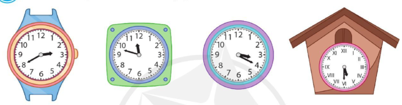 a) Xác định vị trí của kim giờ và kim phút trên mỗi đồng hồ rồi đọc giờ thích hợp.