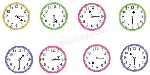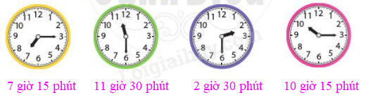 Mỗi đồng hồ sau chỉ mấy giờ? Quay kim trên mặt đồng hồ để đồng hồ chỉ: a) 4 giờ 15 phút, 5 giờ rưỡi, 11 giờ 15 phút, 12 giờ 30 phút. b) 13 giờ rưỡi, 14 giờ 15 phút, 19 giờ 15 phút, 22 giờ 30 phút.