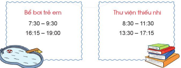 Quan sát hình vẽ rồi nêu thời gian mở cửa và đóng cửa cho các địa điểm.