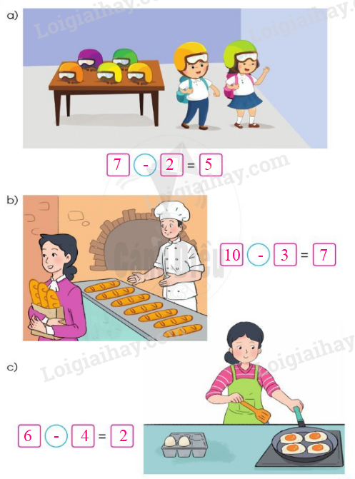 a) Có 7 chiếc mũ, 2 chiếc mũ được các bạn nhỏ lấy đi, còn lại 5 chiếc mũ. Ta có phép trừ 7 – 2 = 5