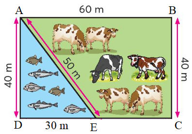 Câu 4. Bác An có một mảnh vườn như hình vẽ. Tính chu vi của ao cá và trang trại nuôi bò của bác An.
