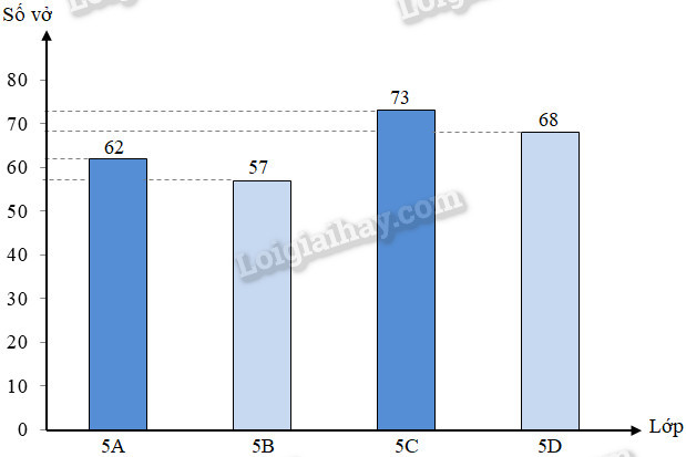 Biểu đồ dưới đây cho biết số quyển vở mà mỗi lớp trong khối lớp 5 quyên góp được: