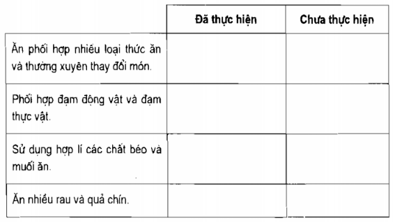 Tự nhận xét về các bữa ăn trong tuần của bạn và đánh dấu x vào cột phù hợp trong bảng sau: