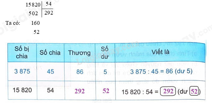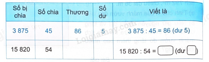 Thực hiện phép chia rồi ghi thương và số dư vào trong bảng.