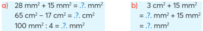 Số? a) 1cm2 = ……… mm2 Tính. a) 28 mm2 + 15 mm2 = ………. mm2