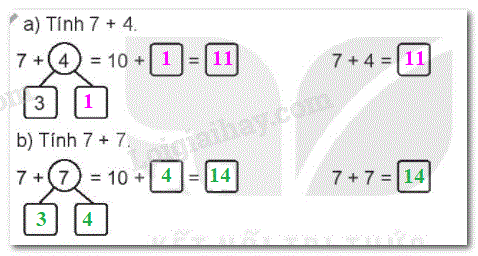 a) Tính 7 + 4 b) Tính 7 + 7 Số? Nối (theo mẫu). Trên sân có 8 con gà và 6 con vịt. Hỏi cả gà và vịt có bao nhiêu con?