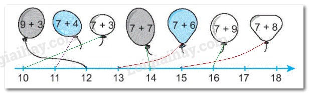 b) Tính nhẩm kết quả phép cộng ghi trên mỗi bóng bay rồi nối với số thích hợp trên tia số.