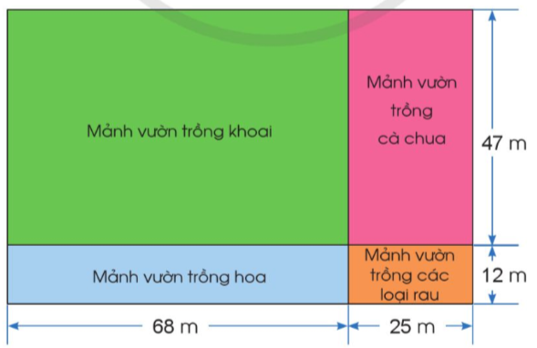 Tính diện tích từng mảnh vườn và diện tích cả khu vườn theo sơ đồ dưới đây: