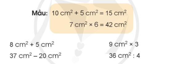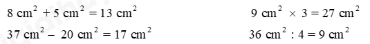 Thực hiện phép tính với các số rồi viết thêm đơn vị xăng-ti-mét vuông vào sau kết quả.