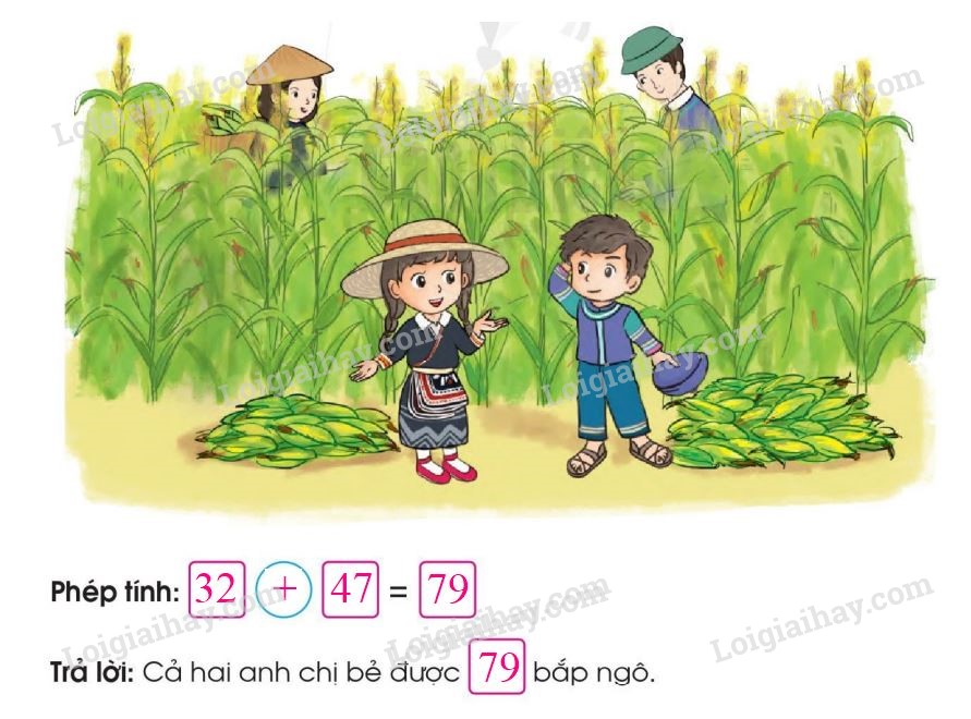 Chị Mai bẻ được 32 bắp ngô, anh Tuấn bẻ được 47 bắp. Hỏi cả hai anh chị bẻ được bao nhiêu bắp ngô?