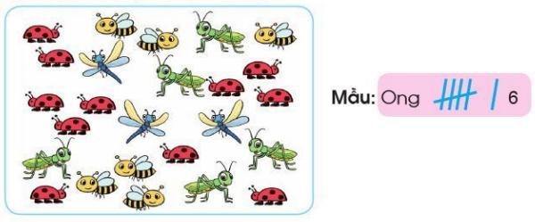 Kiểm đếm số lượng từng loại con vật: châu chấu, chuồn chuồn, bọ rùa và ghi lại kết quả (theo mẫu):