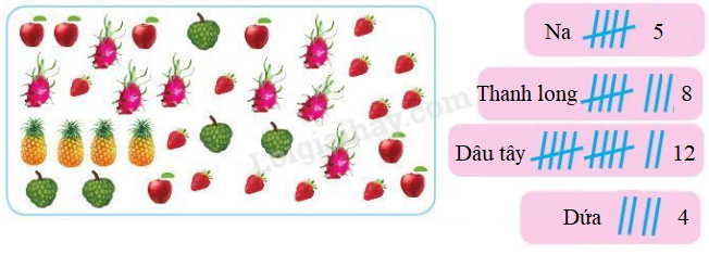 Quan sát tranh, em đếm số quả na, dâu tây, thanh long, dứa rồi ghi lại số lượng mỗi loại quả theo mẫu.