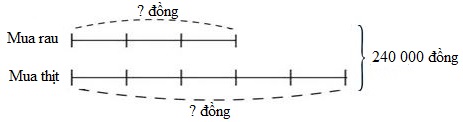 Mẹ đi chợ mua thịt và rau hết 240 000 đồng, số tiền mua rau bằng 60% số tiền mua thịt. Hỏi mẹ mua thịt hết bao nhiêu tiền, mua rau hết bao nhiêu tiền ?