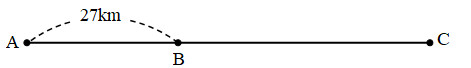 Một người đi xe đạp từ B theo hướng đến C với vận tộc 15km/giờ. Cùng lúc đó, một người đi xe máy từ A với vận tốc 42km/giờ cùng chiều với người đi xe đạp. Biết quãng đường từ A đến B dài 27km. Hỏi sau bao nhiêu phút người đi xe máy đuổi kịp người đi xe đạp ?