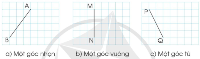 Trong các góc sau, góc nào là góc nhọn, góc vuông, góc tù, góc bẹt?